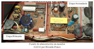 Pero si observa en este monitor, la entrada de cable de alimentación se dirige al frente del monitor. Si no presta atención a esta clase de detalles, le resultará difícil interpretar que en esta fuente la etapa primaria está al frente de la placa.